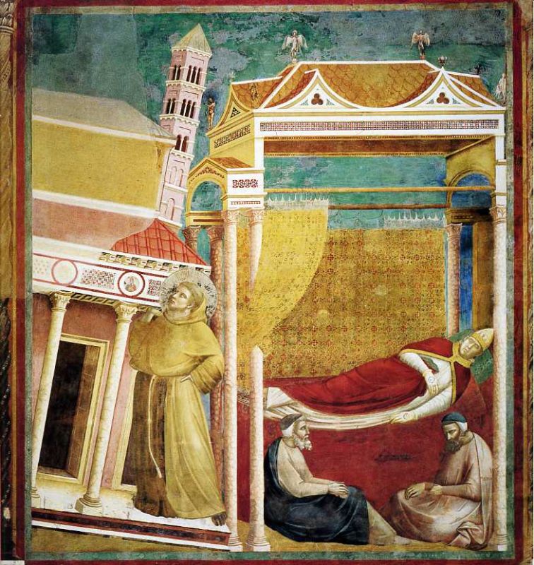 Molti furono inizialmente i dubbi sulla paternità del ciclo della vita di san Francesco nella basilica di Assisi, ma quasi tutti gli studiosi sono oramai d’accordo sull’attribuire a lui il merito per questa meravigliosa creazione, qui vediamo un Giotto attentissimo ai dettagli e alla comunicazione, come nella scena in cui Francesco parla con la croce nella chiesa di san Damiano, dove possiamo vedere come il pittore fiorentino scorpori la chiesa per mostrare san Francesco all’interno, ma anche per dare un idea di un rudere, simbolo di una chiesa in decadenza che il frate dovrà riedificare in senso spirituale e materiale. Vediamo come anche nel sogno di Innocenzo III il santo regge la struttura della chiesa come edificio, simbolo di colui che fonderà una nuova chiesa su ideali di umiltà e carità.