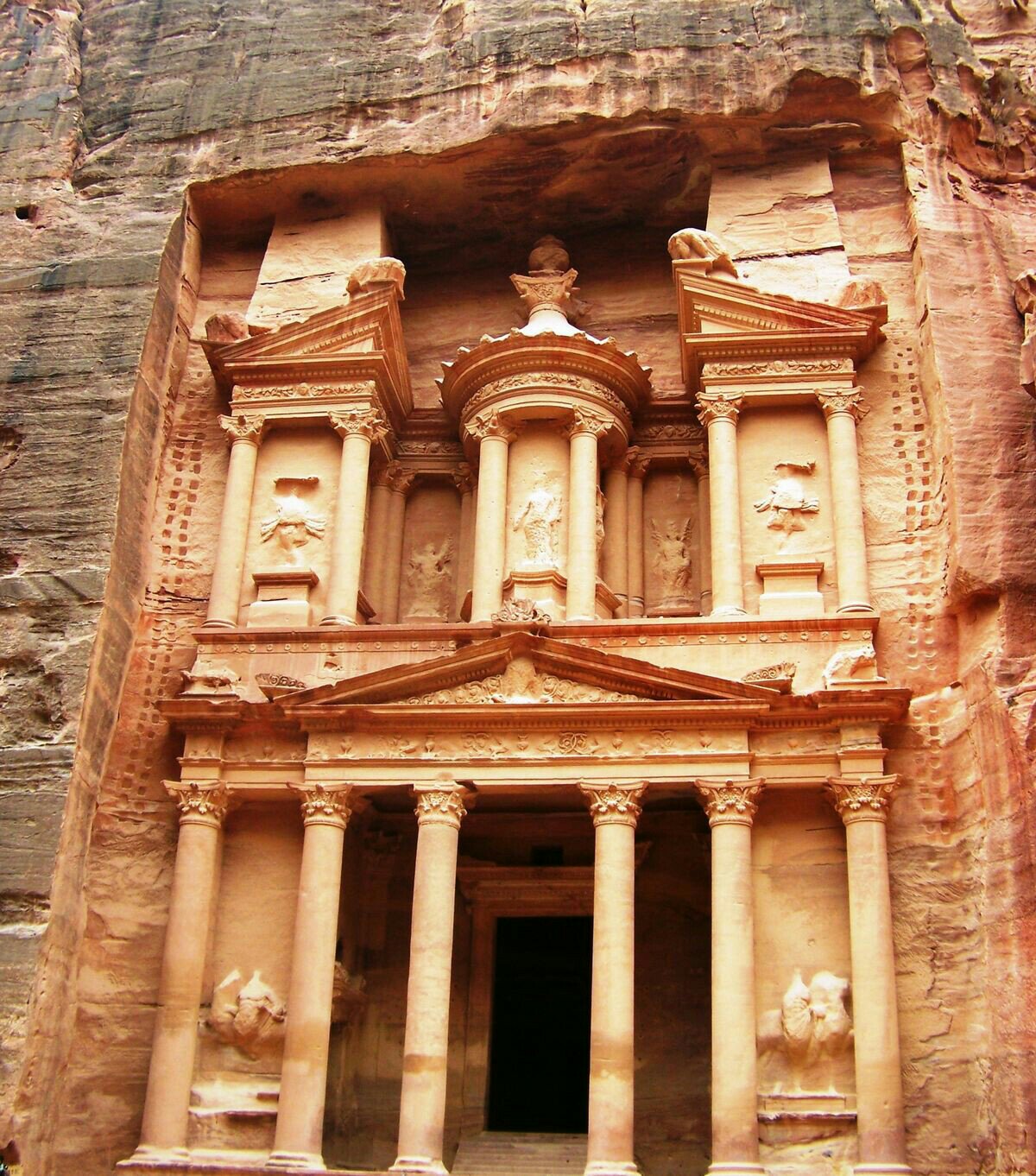 Petra, Giordania! Chiamata “il tesoro del faraone” la datazione di questa tomba è ancora incerta, si crede sia stata costruita tra il 100 a. C ed il 200 d. C. Il suo nome viene dalla leggenda secondo cui nell’urna, che si trova sul secondo ordine, vi fosse un tesoro. Per questo nel tempo la tomba di soggetta a spari per cercare di rompere la roccia.